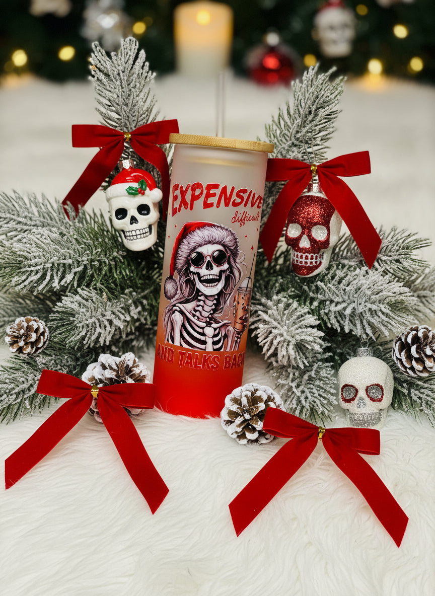 Raise a glass to the gloriously unfiltered. This frosted tumbler features a skeleton sporting a cheeky Santa hat—because the best gifts don't apologize. Perfect for anyone who's expensive in taste, difficult to please, and never holds back their opinions. Double-walled frosted glass keeps drinks at the ideal temperature while the bold design makes a statement that's impossible to ignore. Cheers to being authentically, un-apologetically you.