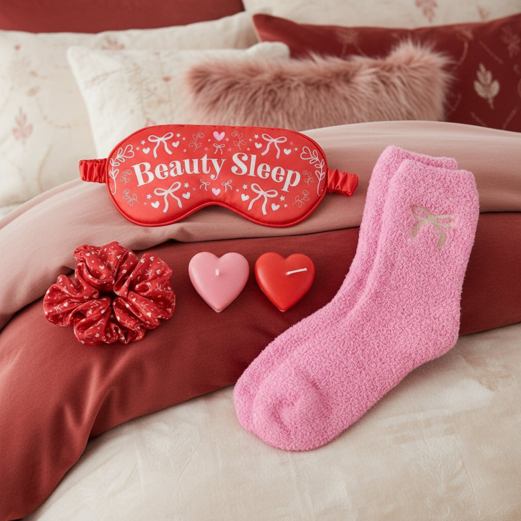 Indulge in a moment of pure bliss with the Self Love Club Cherry Drop set—your ticket to cosy nights and guilt-free relaxation. This delightful collection brings together everything you need for the ultimate pampering session: plush pink socks to keep your toes toasty, a luxe red satin eye mask for beauty sleep, a coordinating scrunchie, and two charming heart-shaped candles to spark that self-care magic, a cherry print glass with bamboo lid and plastic straw for sipping your favourite drink & a cherry heart print zip up bag with heart charm, it's ready to gift or keep for yourself.
